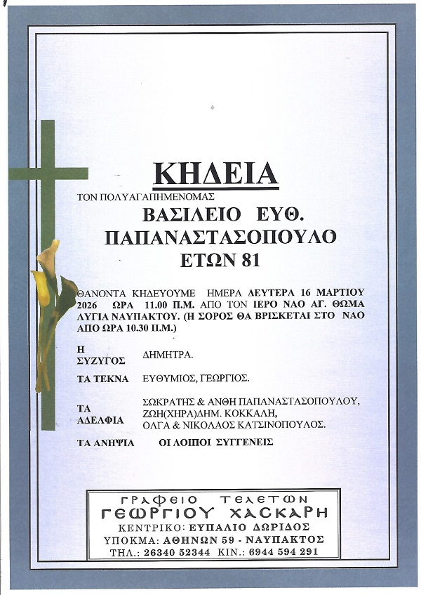 ΚΗΔΕΙΑ – ΔΕΥΤΕΡΑ 16/3/2026 – ΒΑΣΙΛΕΙΟΣ Ε. ΠΑΠΑΝΑΣΤΑΣΟΠΟΥΛΟΣ ΕΤΩΝ 81