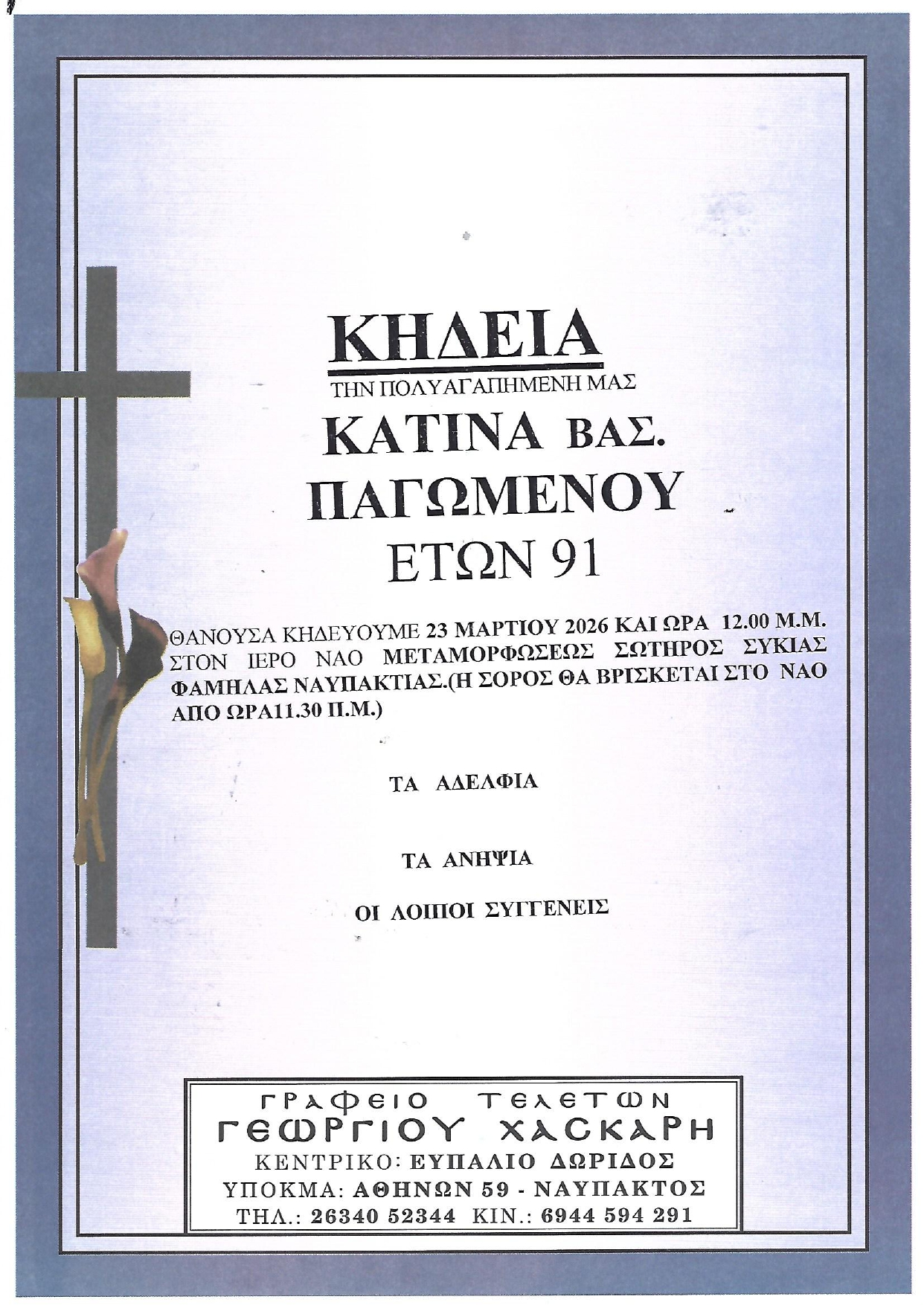 ΚΗΔΕΙΑ – ΔΕΥΤΕΡΑ 23/3/2026 – ΚΑΤΙΝΑ Β. ΠΑΓΩΜΕΝΟΥ ΕΤΩΝ 91