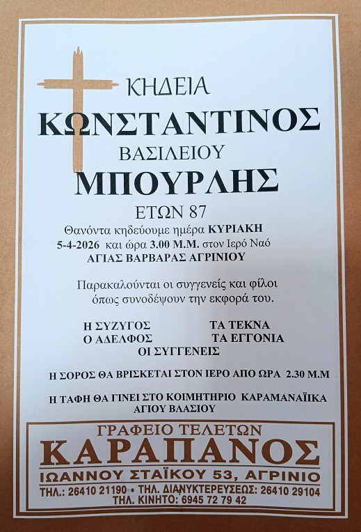 ΑρχικήΚΗΔΕΙΕΣAιτωλοακαρνανίαςΚΗΔΕΙΑ - ΚΥΡΙΑΚΗ 5/4/2026 - ΚΩΝΣΤΑΝΤΙΝΟΣ Β. ΜΠΟΥΡΛΗΣ ΕΤΩΝ 87