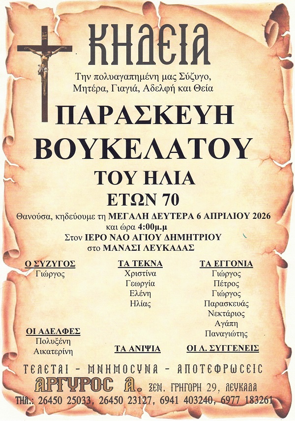 ΑρχικήΚΗΔΕΙΕΣΛευκάδαςΚΗΔΕΙΑ - ΜΕΓΑΛΗ ΔΕΥΤΕΡΑ 6/4/2026 - ΠΑΡΑΣΚΕΥΗ Η. ΒΟΥΚΕΛΑΤΟΥ ΕΤΩΝ 70