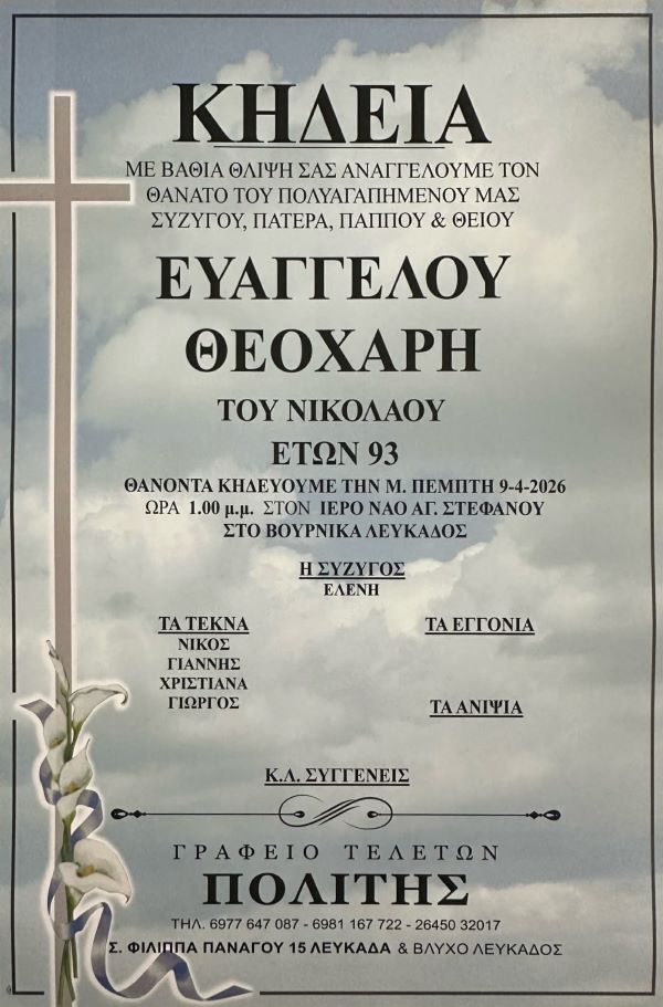 ΑρχικήΚΗΔΕΙΕΣΛευκάδαςΚΗΔΕΙΑ - ΜΕΓΑΛΗ ΠΕΜΠΤΗ 9/4/2026 - ΕΥΑΓΓΕΛΟΣ Ν. ΘΕΟΧΑΡΗΣ ΕΤΩΝ 93