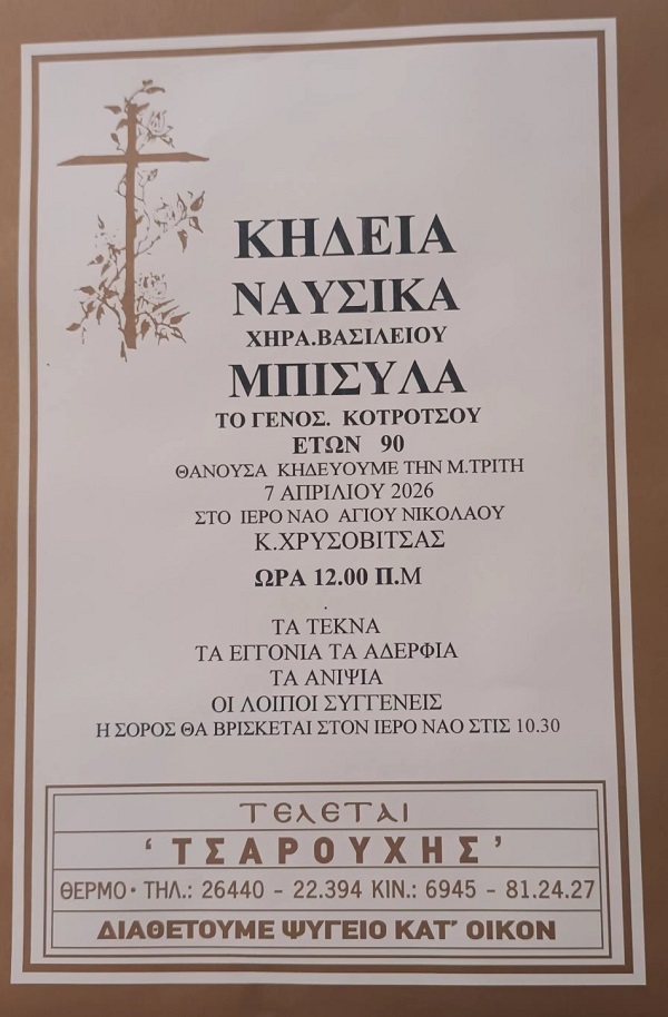 ΚΗΔΕΙΑ – ΜΕΓΑΛΗ ΤΡΙΤΗ 7/4/2026 – ΝΑΥΣΙΚΑ Β. ΜΠΙΣΥΛΑ-ΚΟΤΡΟΤΣΟΥ ΕΤΩΝ 90