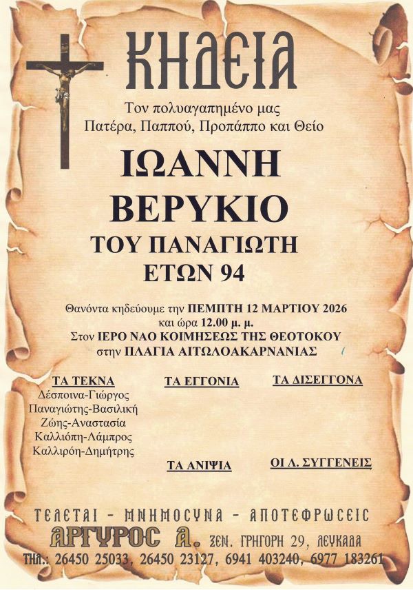 ΑρχικήΚΗΔΕΙΕΣAιτωλοακαρνανίαςΚΗΔΕΙΑ - ΠΕΜΠΤΗ 12/3/2026 - ΙΩΑΝΝΗΣ Π. ΒΕΡΥΚΙΟΣ ΕΤΩΝ 94