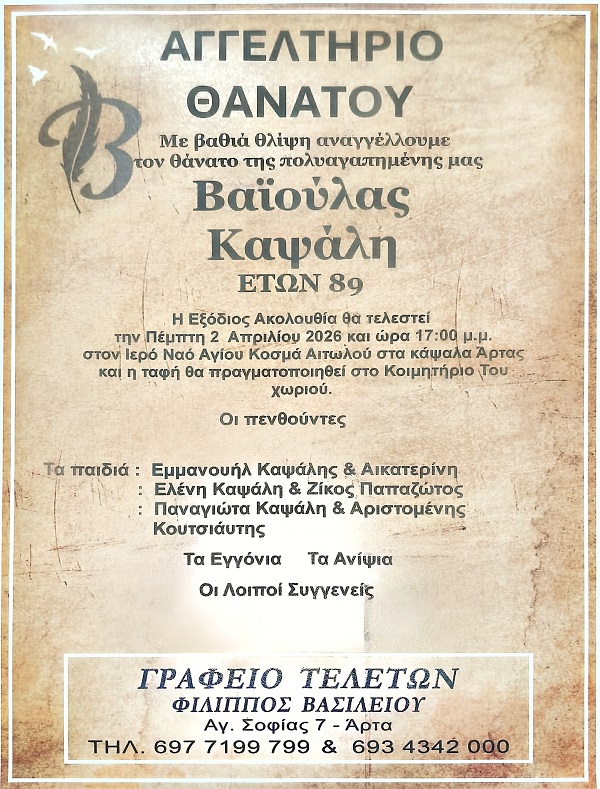 ΑρχικήΚΗΔΕΙΕΣΆρταςΚΗΔΕΙΑ - ΠΕΜΠΤΗ 2/4/2026 - ΒΑΪΟΥΛΑ ΚΑΨΑΛΗ ΕΤΩΝ 89