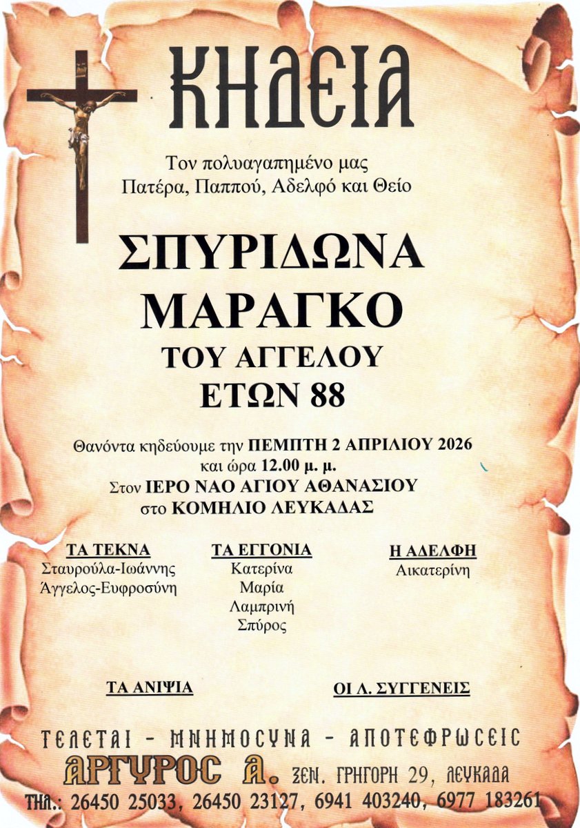 ΑρχικήΚΗΔΕΙΕΣΛευκάδαςΚΗΔΕΙΑ - ΠΕΜΠΤΗ 2/4/2026 - ΣΠΥΡΙΔΩΝΑΣ Α. ΜΑΡΑΓΚΟΣ ΕΤΩΝ 88