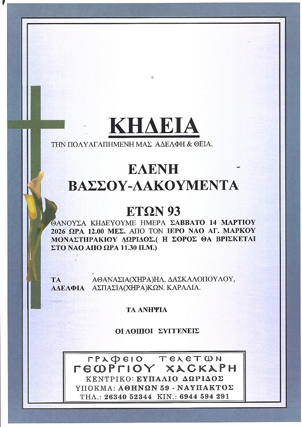 ΑρχικήΚΗΔΕΙΕΣΦωκίδαςΚΗΔΕΙΑ - ΣΑΒΒΑΤΟ 14/3/2026 - ΕΛΕΝΗ ΒΑΣΣΟΥ-ΛΑΚΟΥΜΕΝΤΑ ΕΤΩΝ 93