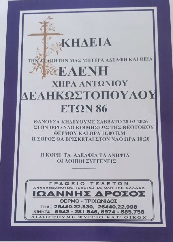 ΑρχικήΚΗΔΕΙΕΣAιτωλοακαρνανίαςΚΗΔΕΙΑ - ΣΑΒΒΑΤΟ 28/3/2026 - ΕΛΕΝΗ Α. ΔΕΛΗΚΩΣΤΟΠΟΥΛΟΥ ΕΤΩΝ 86