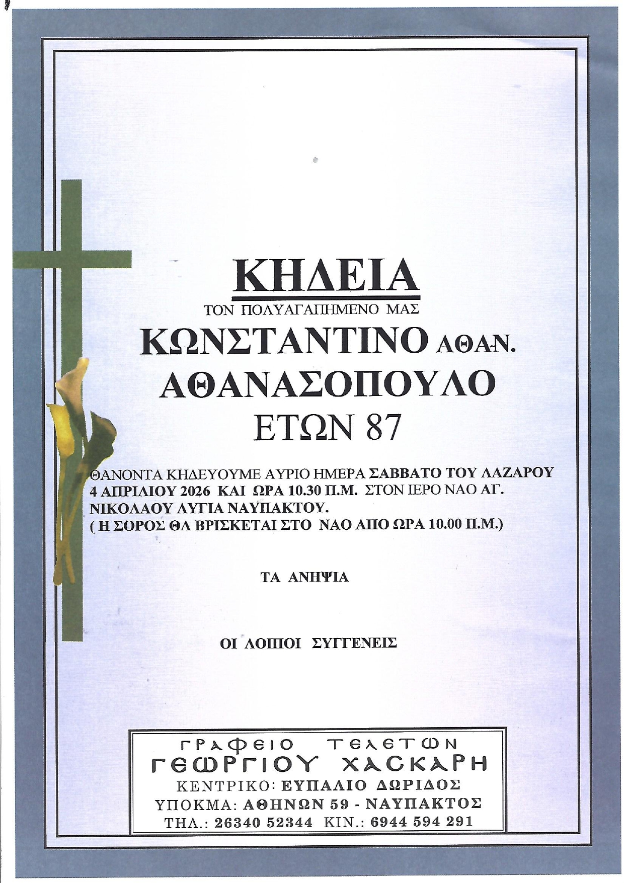 ΚΗΔΕΙΑ – ΣΑΒΒΑΤΟ 4/4/2026 – ΚΩΝΣΤΑΝΤΙΝΟΣ Α. ΑΘΑΝΑΣΟΠΟΥΛΟΣ ΕΤΩΝ 87