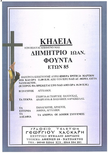 ΑρχικήΚΗΔΕΙΕΣAιτωλοακαρνανίαςΚΗΔΕΙΑ ΤΡΙΤΗ 24/3/2026 - ΔΗΜΗΤΡΙΟΣ Ι. ΦΟΥΝΤΑΣ ΕΤΩΝ 85