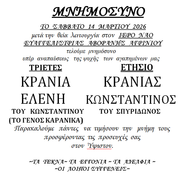 ΜΝΗΜΟΣΥΝΟ 14/3/2026 – ΚΩΝΣΤΑΝΤΙΝΟΣ & ΕΛΕΝΗ ΚΡΑΝΙΑ