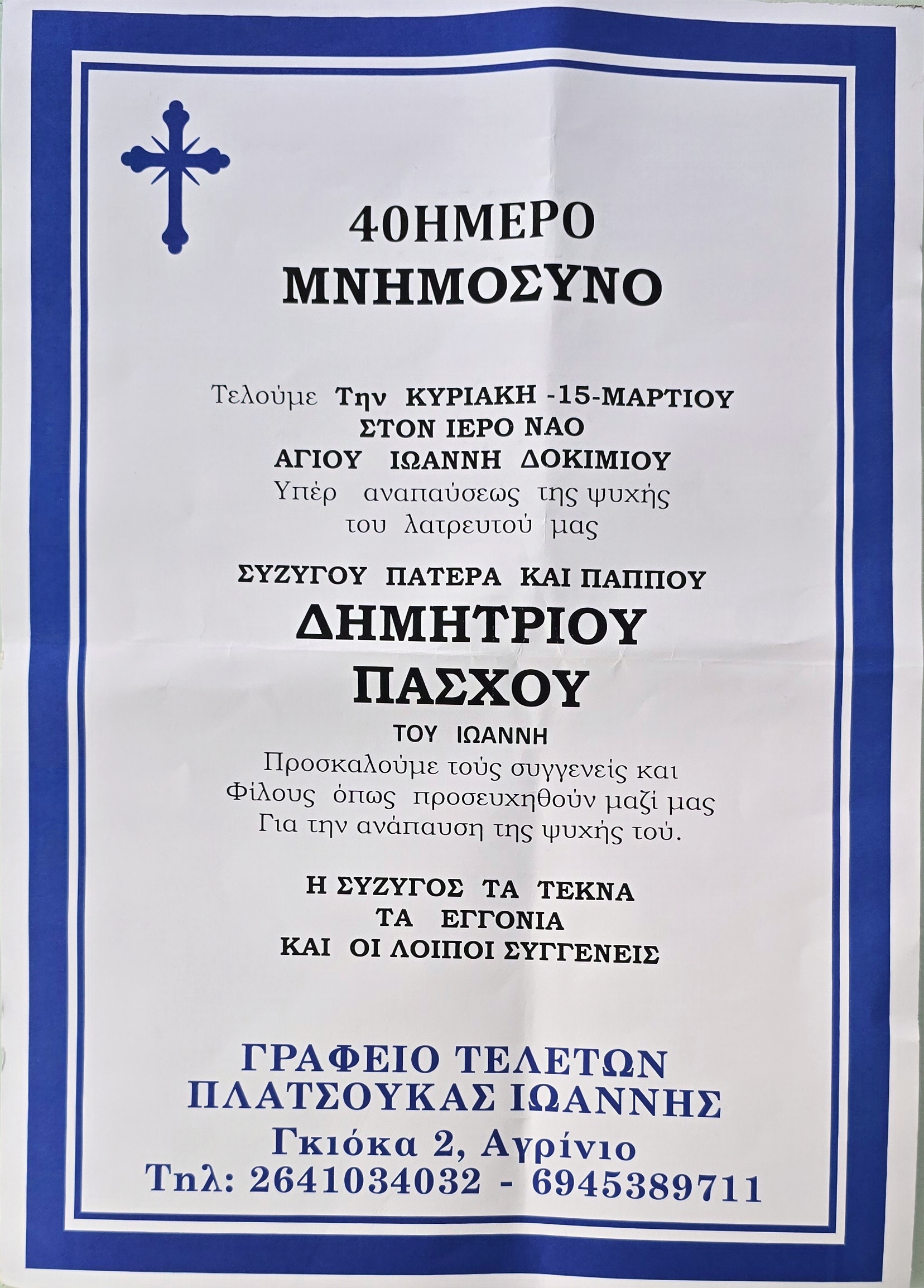 ΑρχικήΜΝΗΜΟΣΥΝΑΑιτωλοακαρνανίαςΜΝΗΜΟΣΥΝΟ 15/3/2026 - ΔΗΜΗΤΡΙΟΣ Ι. ΠΑΣΧΟΣ 40ΗΜΕΡΟ
