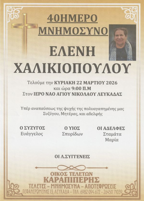 ΑρχικήΜΝΗΜΟΣΥΝΑΛευκάδαςΜΝΗΜΟΣΥΝΟ 22/3/2026 - ΕΛΕΝΗ ΧΑΛΙΚΙΟΠΟΥΛΟΥ 40ΗΜΕΡΟ