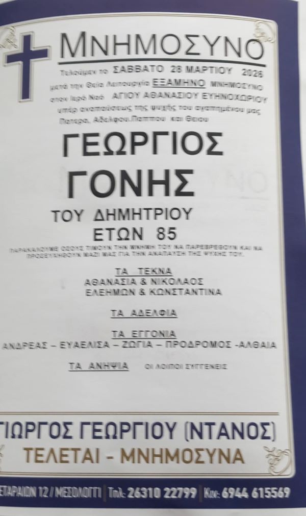 ΜΝΗΜΟΣΥΝΟ 28/3/2026 – ΓΕΩΡΓΙΟΣ Δ. ΓΟΝΗΣ ΕΞΑΜΗΝΟ