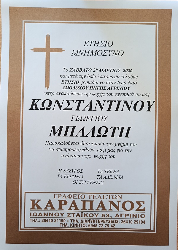 ΑρχικήΜΝΗΜΟΣΥΝΑΑιτωλοακαρνανίαςΜΝΗΜΟΣΥΝΟ 28/3/2026 - ΚΩΝΣΤΑΝΤΙΝΟΣ Γ. ΜΠΑΛΩΤΗΣ ΕΤΗΣΙΟ