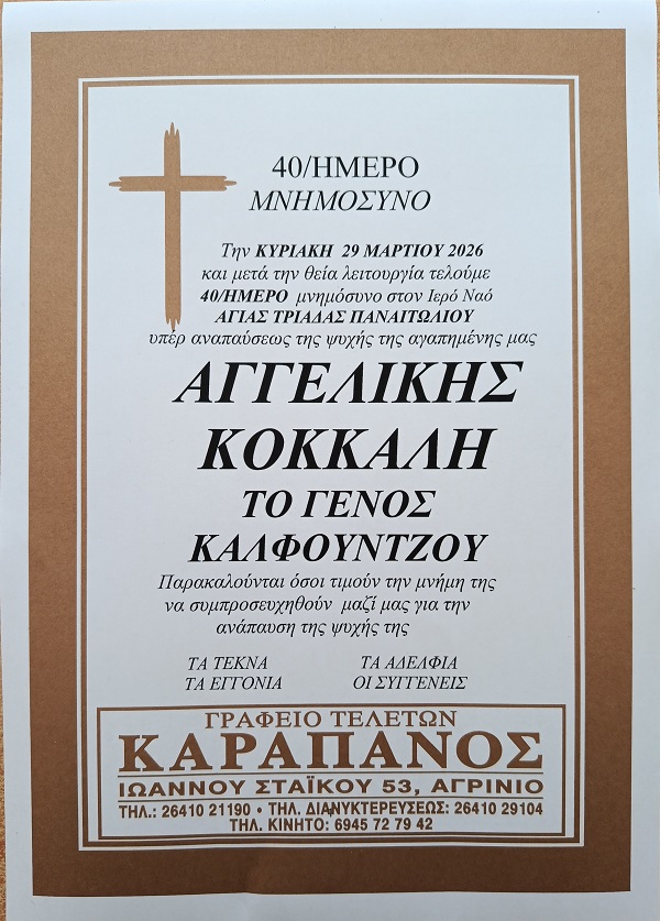 ΜΝΗΜΟΣΥΝΟ 29/3/2026 – ΑΓΓΕΛΙΚΗ ΚΟΚΚΑΛΗ-ΚΑΛΦΟΥΝΤΖΟΥ 40ΗΜΕΡΟ