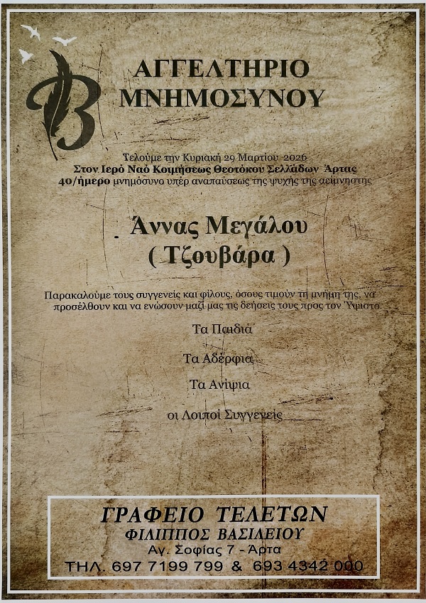 ΑρχικήΜΝΗΜΟΣΥΝΑΆρταςΜΝΗΜΟΣΥΝΟ 29/3/2026 - ΑΝΝΑ ΜΕΓΑΛΟΥ 40ΗΜΕΡΟ