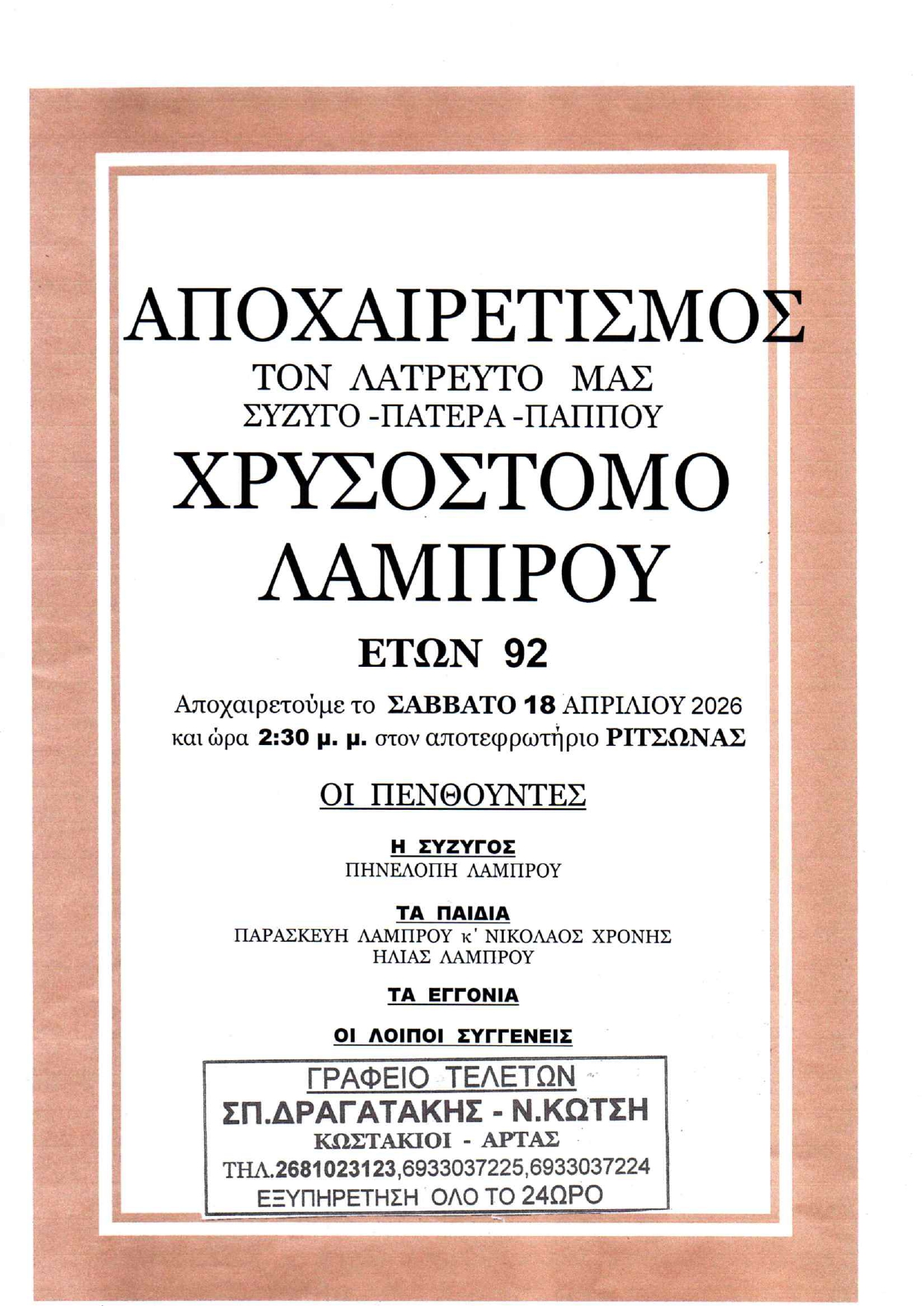 ΑρχικήΚΗΔΕΙΕΣΆρταςΑΠΟΧΑΙΡΕΤΙΣΜΟΣ - ΣΑΒΒΑΤΟ 18/4/2026 - ΧΡΥΣΟΣΤΟΜΟΣ ΛΑΜΠΡΟΥ ΕΤΩΝ 92