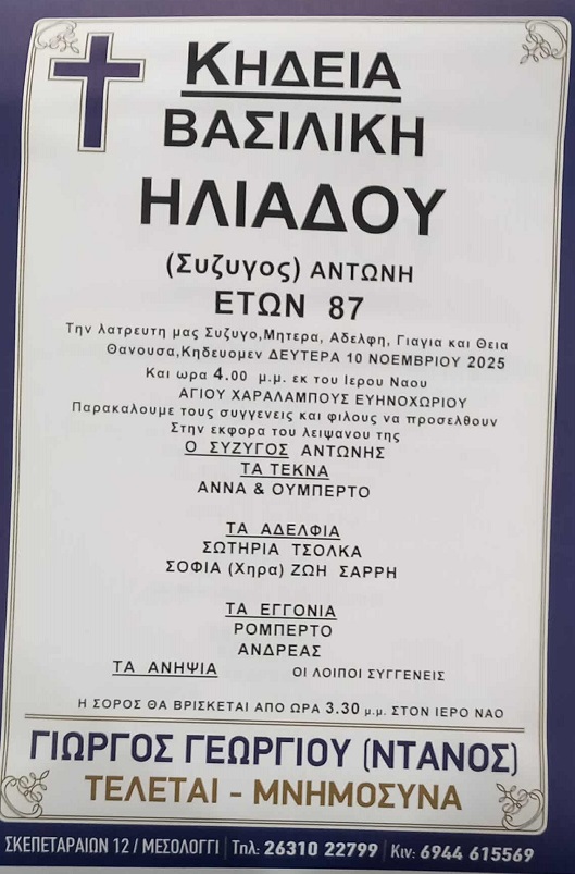 ΚΗΔΕΙΑ – ΔΕΥΤΕΡΑ 10/11/2025 – ΒΑΣΙΛΙΚΗ Α. ΗΛΙΑΔΟΥ ΕΤΩΝ 87