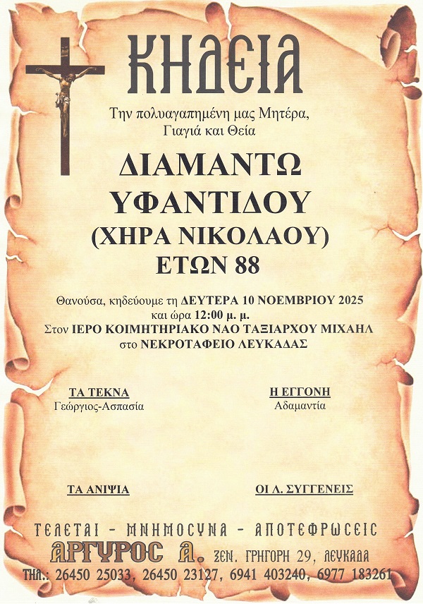 ΑρχικήΚΗΔΕΙΕΣΛευκάδαςΚΗΔΕΙΑ - ΔΕΥΤΕΡΑ 10/11/2025 - ΔΙΑΜΑΝΤΩ Ν. ΥΦΑΝΤΙΔΟΥ ΕΤΩΝ 88