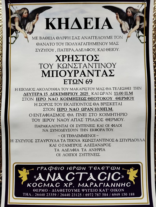 ΑρχικήΚΗΔΕΙΕΣAιτωλοακαρνανίαςΚΗΔΕΙΑ - ΔΕΥΤΕΡΑ 15/12/2025 - ΧΡΗΣΤΟΣ Κ. ΜΠΟΥΡΑΝΤΑΣ ΕΤΩΝ 69