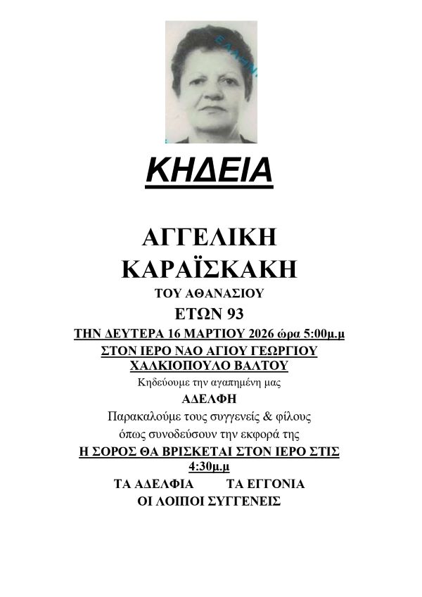 ΚΗΔΕΙΑ – ΔΕΥΤΕΡΑ 16/3/2026 – ΑΓΓΕΛΙΚΗ Α. ΚΑΡΑΪΣΚΑΚΗ ΕΤΩΝ 93