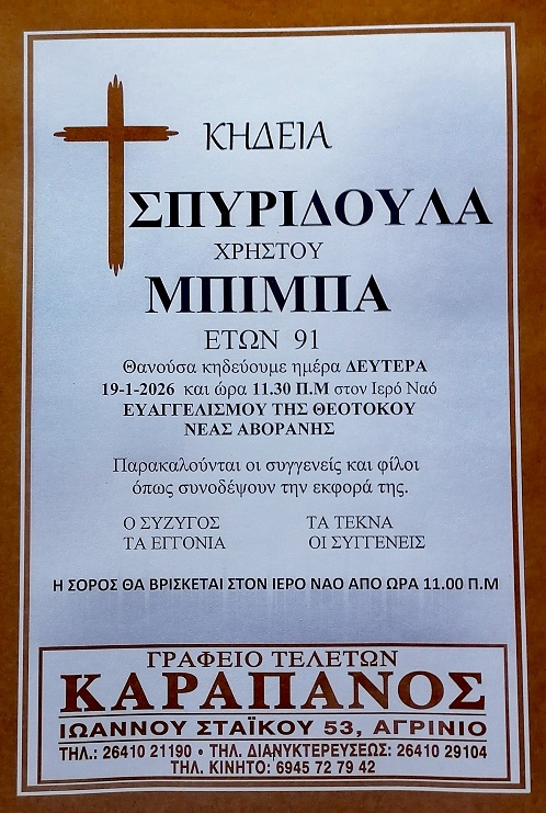 ΑρχικήΚΗΔΕΙΕΣAιτωλοακαρνανίαςΚΗΔΕΙΑ - ΔΕΥΤΕΡΑ 19/1/2026 - ΣΠΥΡΙΔΟΥΛΑ Χ. ΜΠΙΜΠΑ ΕΤΩΝ 91