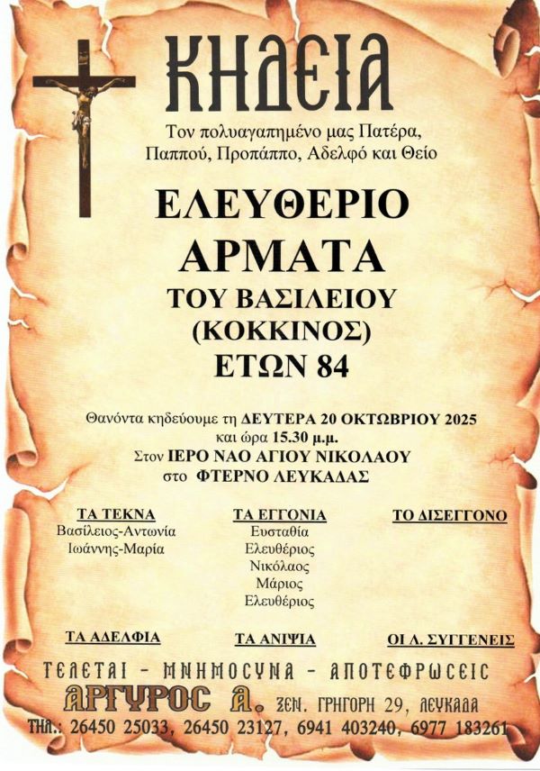 ΑρχικήΚΗΔΕΙΕΣΛευκάδαςΚΗΔΕΙΑ - ΔΕΥΤΕΡΑ 20/10/2025 - ΕΛΕΥΘΕΡΙΟΣ Β. ΑΡΜΑΤΑΣ ΕΤΩΝ 84
