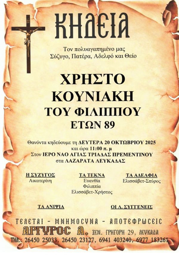 ΑρχικήΚΗΔΕΙΕΣΛευκάδαςΚΗΔΕΙΑ - ΔΕΥΤΕΡΑ 20/10/2025 - ΧΡΗΣΤΟΣ Φ. ΚΟΥΝΙΑΚΗΣ ΕΤΩΝ 89