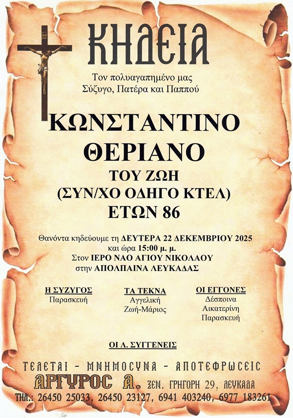 ΚΗΔΕΙΑ – ΔΕΥΤΕΡΑ 22/12/2025 – ΚΩΝΣΤΑΝΤΙΝΟΣ Ζ. ΘΕΡΙΑΝΟΣ ΕΤΩΝ 86