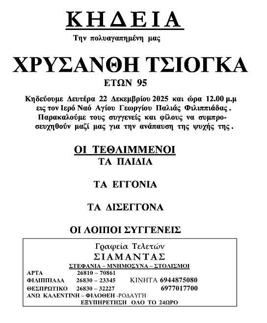 ΑρχικήΚΗΔΕΙΕΣΠρέβεζαςΚΗΔΕΙΑ - ΔΕΥΤΕΡΑ 22/12/2025 - ΧΡΥΣΑΝΘΗ ΤΣΙΟΓΚΑ ΕΤΩΝ 95