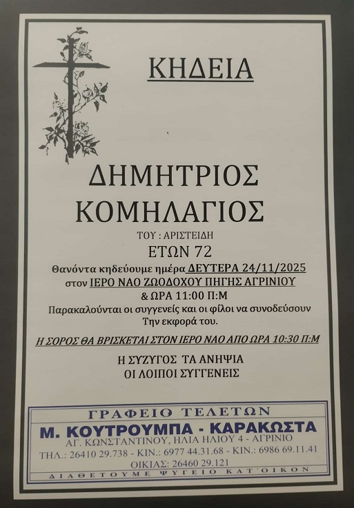 ΑρχικήΚΗΔΕΙΕΣAιτωλοακαρνανίαςΚΗΔΕΙΑ - ΔΕΥΤΕΡΑ 24/11/2025 - ΔΗΜΗΤΡΙΟΣ Α. ΚΟΜΗΛΑΓΙΟΣ ΕΤΩΝ 72