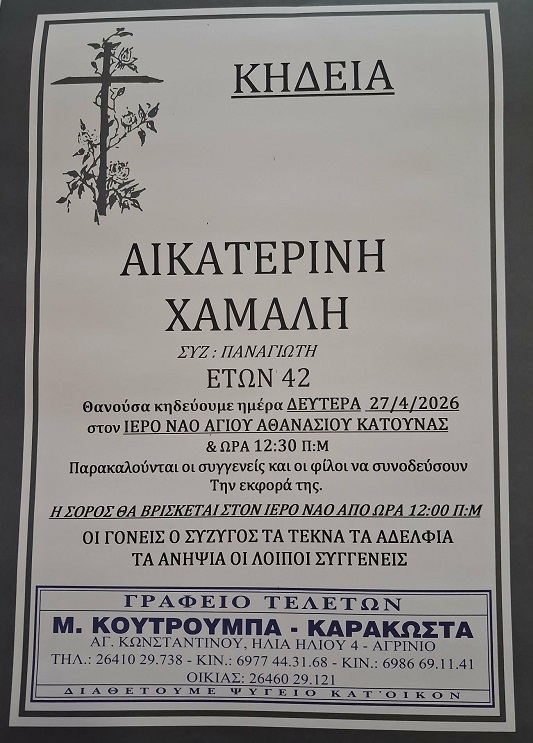 ΚΗΔΕΙΑ – ΔΕΥΤΕΡΑ 27/4/2026 – ΑΙΚΑΤΕΡΙΝΗ Π. ΧΑΜΑΛΗ ΕΤΩΝ 42