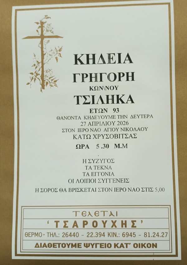 ΑρχικήΚΗΔΕΙΕΣAιτωλοακαρνανίαςΚΗΔΕΙΑ - ΔΕΥΤΕΡΑ 27/4/2026 - ΓΡΗΓΟΡΗΣ Κ. ΤΣΙΛΗΚΑΣ ΕΤΩΝ 93