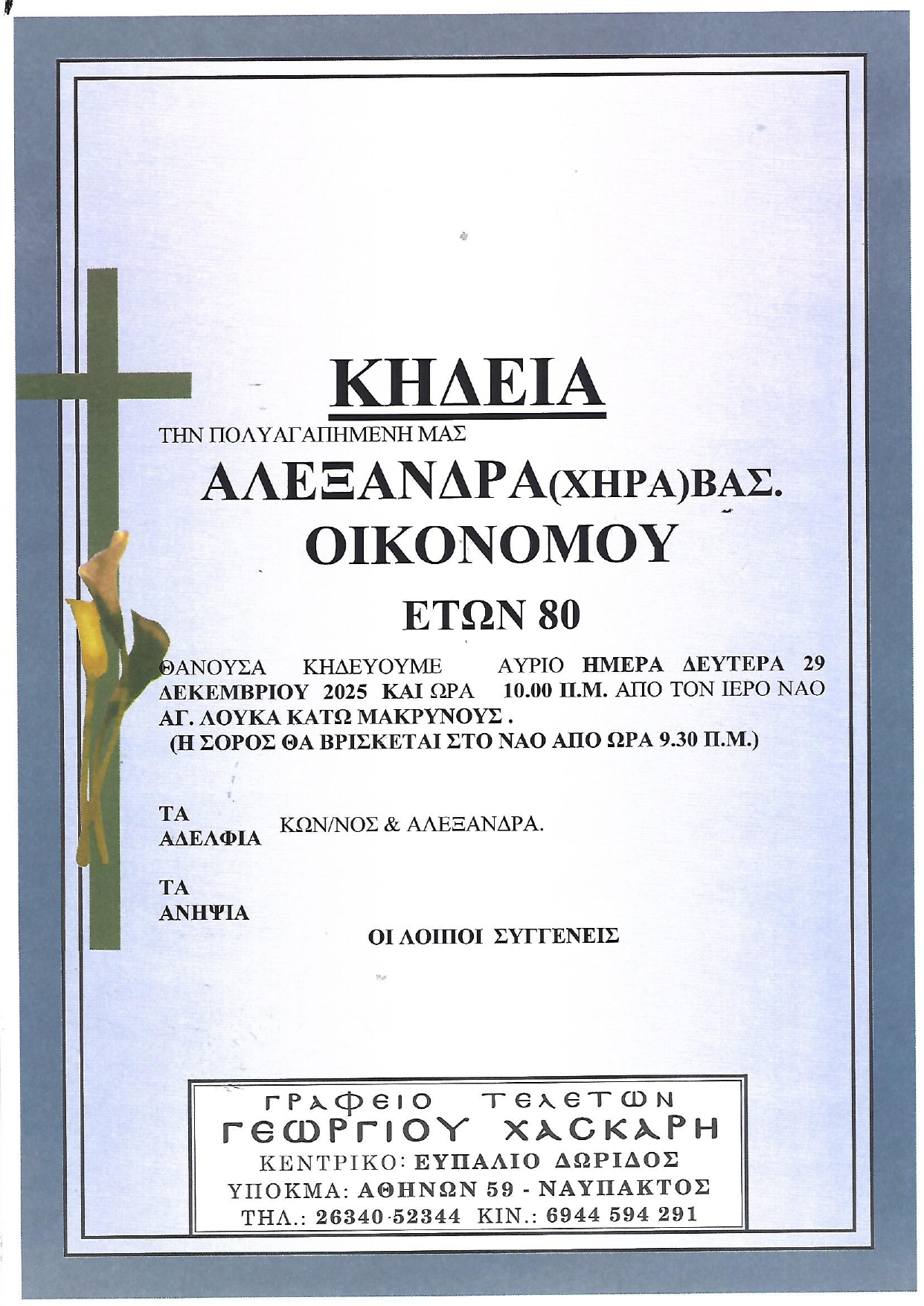 ΚΗΔΕΙΑ – ΔΕΥΤΕΡΑ 29/12/2025 – ΑΛΕΞΑΝΔΡΑ Β.ΟΙΚΟΝΟΜΟΥ ΕΤΩΝ 80