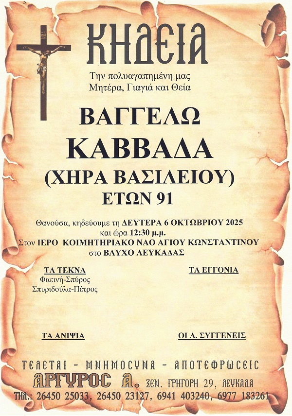 ΚΗΔΕΙΑ – ΔΕΥΤΕΡΑ 6/10/2025 – ΒΑΓΓΕΛΩ Β. ΚΑΒΒΑΔΑ ΕΤΩΝ 91