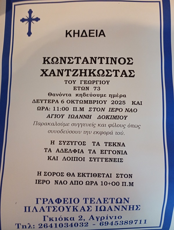ΚΗΔΕΙΑ – ΔΕΥΤΕΡΑ 6/10/2025 – ΚΩΝΣΤΑΝΤΙΝΟΣ Γ. ΧΑΝΤΖΗΚΩΣΤΑΣ ΕΤΩΝ 73