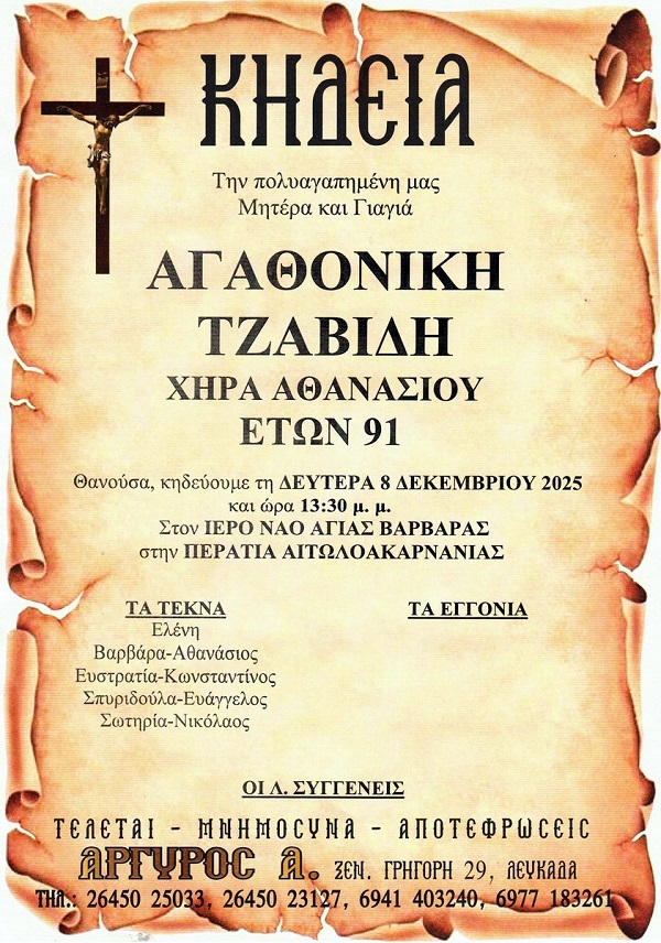 ΑρχικήΚΗΔΕΙΕΣAιτωλοακαρνανίαςΚΗΔΕΙΑ - ΔΕΥΤΕΡΑ 8/12/2025 - ΑΓΑΘΟΝΙΚΗ Α. ΤΖΑΒΙΔΗ ΕΤΩΝ 91