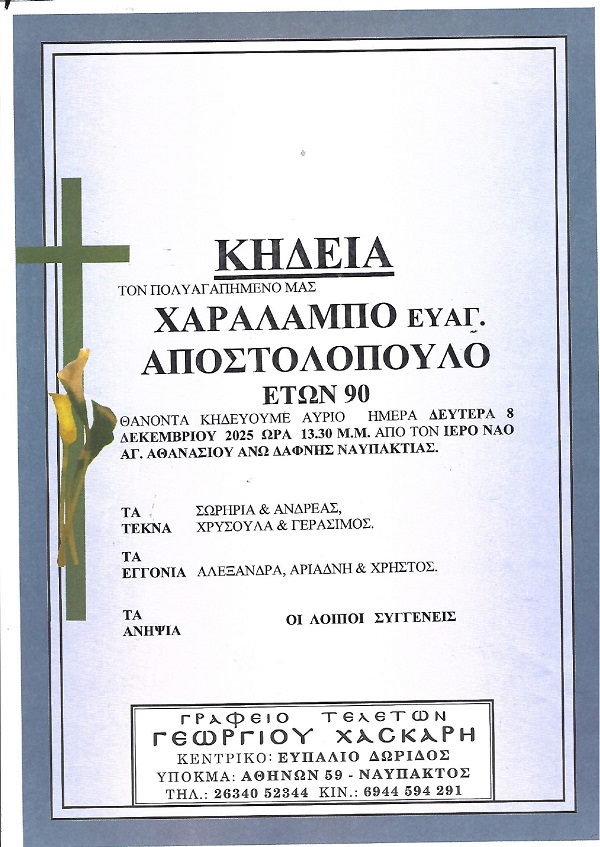 ΑρχικήΚΗΔΕΙΕΣAιτωλοακαρνανίαςΚΗΔΕΙΑ - ΔΕΥΤΕΡΑ 8/12/2025 - ΧΑΡΑΛΑΜΠΟΣ Ε. ΑΠΟΣΤΟΛΟΠΟΥΛΟΣ ΕΤΩΝ 90