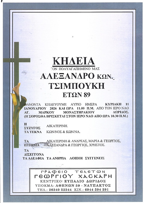 ΑρχικήΚΗΔΕΙΕΣΦωκίδαςΚΗΔΕΙΑ - ΚΥΡΙΑΚΗ 11/1/2026 - ΑΛΕΞΑΝΔΡΟΣ Κ. ΤΣΙΜΠΟΥΚΗΣ ΕΤΩΝ 89