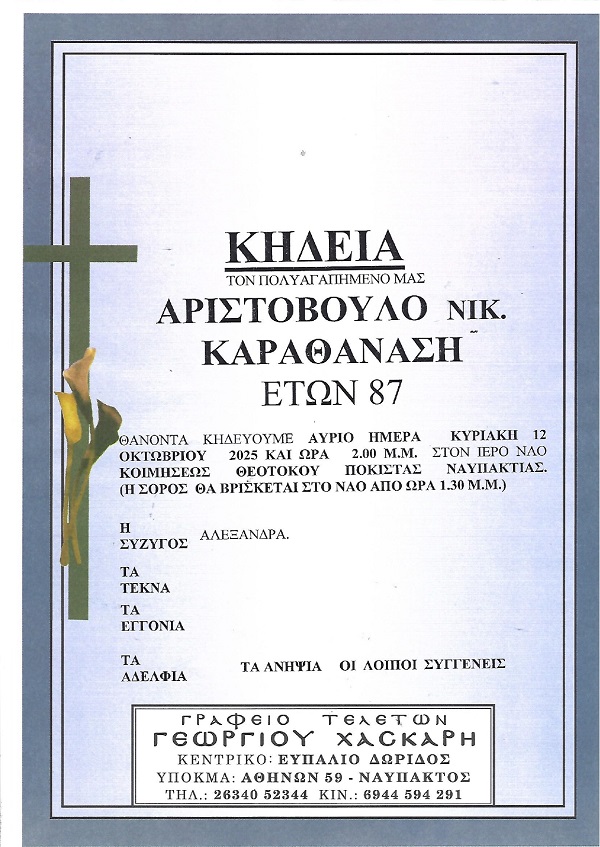 ΚΗΔΕΙΑ – ΚΥΡΙΑΚΗ 12/10/2025 – ΑΡΙΣΤΟΒΟΥΛΟΣ Ν. ΚΑΡΑΘΑΝΑΣΗΣ ΕΤΩΝ 87
