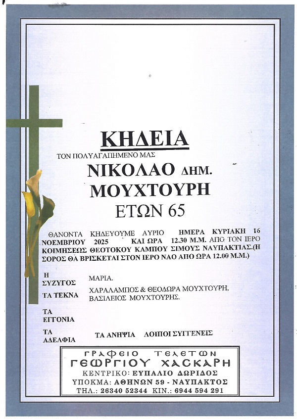 ΚΗΔΕΙΑ – ΚΥΡΙΑΚΗ 16/11/2025 – ΝΙΚΟΛΑΟΣ Δ. ΜΟΥΧΤΟΥΡΗΣ ΕΤΩΝ 65