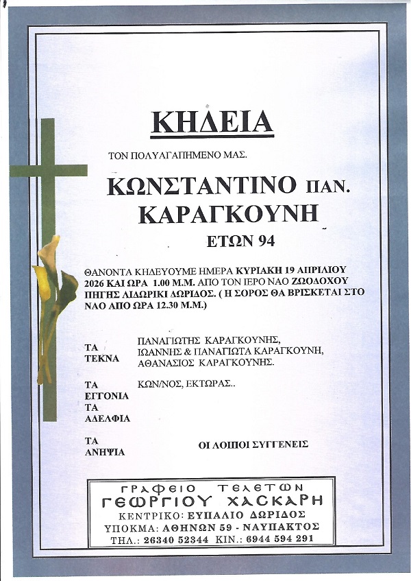 ΑρχικήΚΗΔΕΙΕΣΦωκίδαςΚΗΔΕΙΑ - ΚΥΡΙΑΚΗ 19/4/2026 - ΚΩΝΣΤΑΝΤΙΝΟΣ Π. ΚΑΡΑΓΚΟΥΝΗΣ ΕΤΩΝ 94