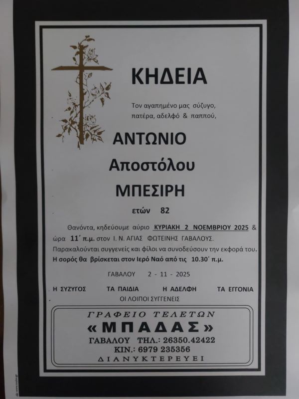 ΚΗΔΕΙΑ – ΚΥΡΙΑΚΗ 2/11/2025 – ΑΝΤΩΝΙΟΣ Α. ΜΠΕΣΙΡΗΣ ΕΤΩΝ 82