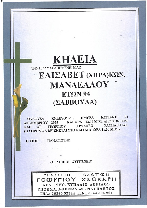 ΚΗΔΕΙΑ – ΚΥΡΙΑΚΗ 21/12/2025 – ΕΛΙΣΑΒΕΤ Κ. ΜΑΝΔΕΛΛΟΥ ΕΤΩΝ 94