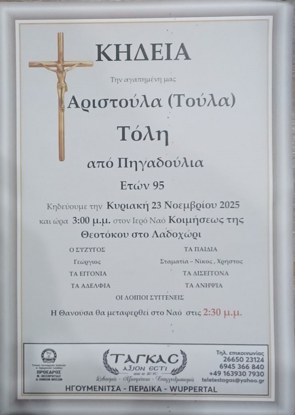 ΚΗΔΕΙΑ – ΚΥΡΙΑΚΗ 23/11/2025 – ΑΡΙΣΤΟΥΛΑ ΤΟΛΗ ΕΤΩΝ 95