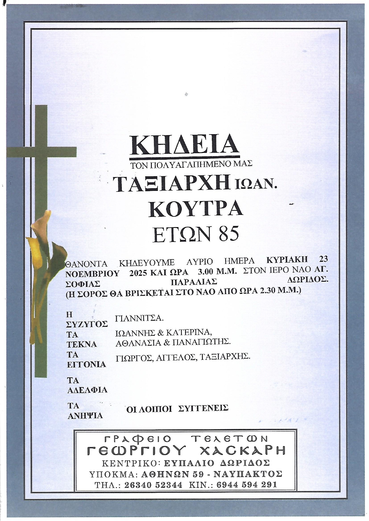 ΑρχικήΚΗΔΕΙΕΣΦωκίδαςΚΗΔΕΙΑ - ΚΥΡΙΑΚΗ 23/11/2025 - ΤΑΞΙΑΡΧΗΣ Ι. ΚΟΥΤΡΑΣ ΕΤΩΝ 85