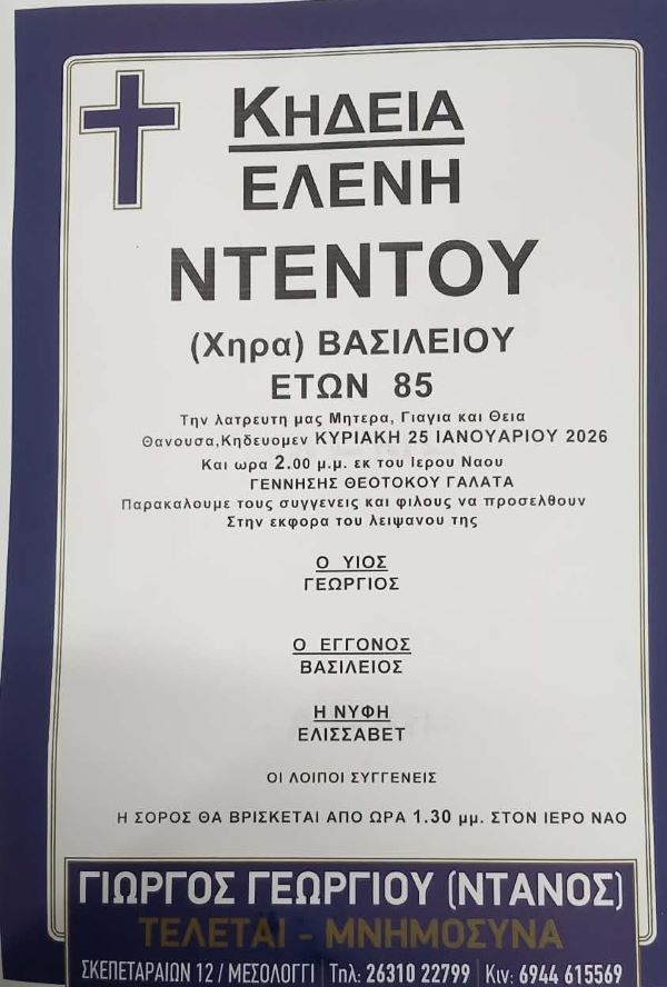 ΑρχικήΚΗΔΕΙΕΣAιτωλοακαρνανίαςΚΗΔΕΙΑ - ΚΥΡΙΑΚΗ 25/1/2026 - ΕΛΕΝΗ Β. ΝΤΕΝΤΟΥ ΕΤΩΝ 85