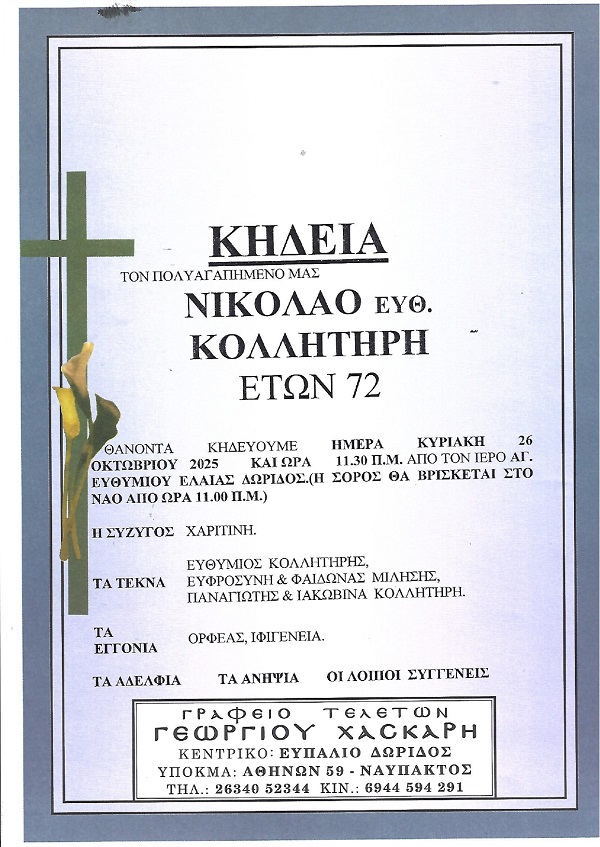 ΑρχικήΚΗΔΕΙΕΣΦωκίδαςΚΗΔΕΙΑ - ΚΥΡΙΑΚΗ 26/10/2025 - ΝΙΚΟΛΑΟΣ Ε. ΚΟΛΛΗΤΗΡΗΣ ΕΤΩΝ 72