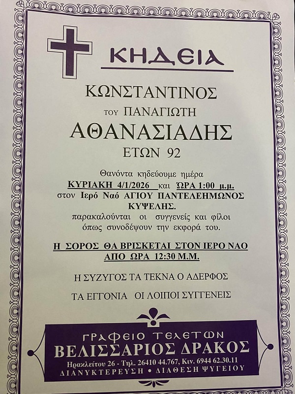 ΚΗΔΕΙΑ – ΚΥΡΙΑΚΗ 4/1/2026 – ΚΩΝΣΤΑΝΤΙΝΟΣ Π. ΑΘΑΝΑΣΙΑΔΗΣ ΕΤΩΝ 92