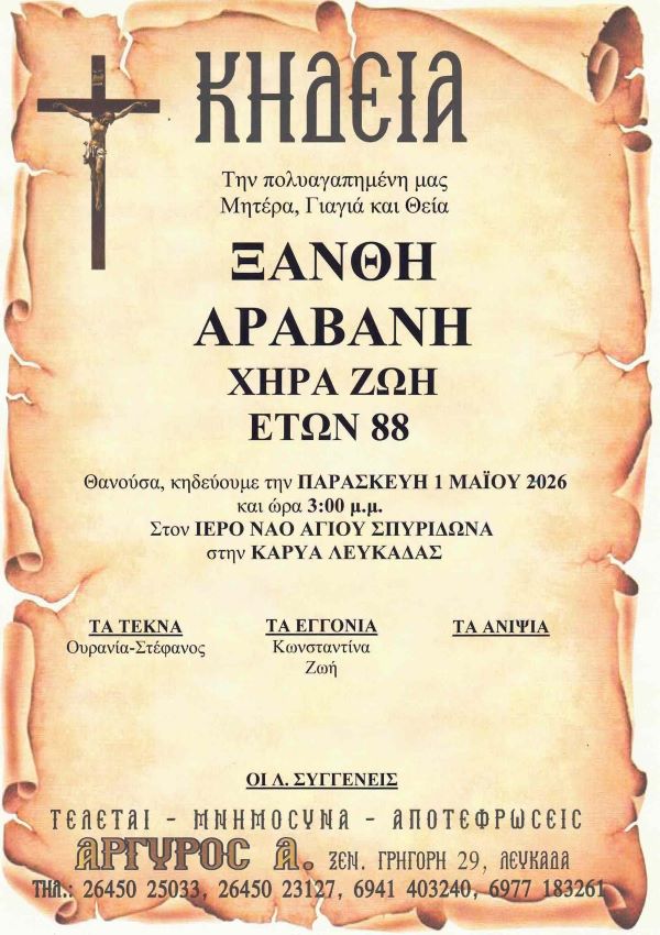 ΑρχικήΚΗΔΕΙΕΣΛευκάδαςΚΗΔΕΙΑ - ΠΑΡΑΣΚΕΥΗ 1/5/2026 - ΞΑΝΘΗ Ζ. ΑΡΑΒΑΝΗ ΕΤΩΝ 88